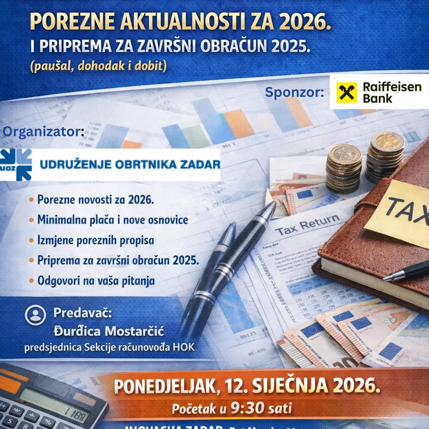 Udruženje obrtnika Zadar u suradnji sa Đurđicom Mostarčić, predsjednicom Sekcije računovođa pri Hrvatskoj obrtničkoj komori, organizira besplatni seminar na temu Porezne aktualnosti za 2026. i priprema za završni obračun 2025. (paušal, dohodak i dobit).